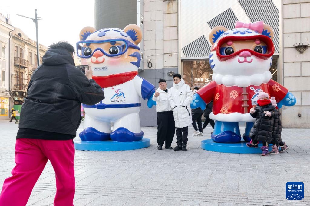 1月8日,在哈尔滨中华巴洛克历史文化街区,游客在亚冬会吉祥物景观前拍照。