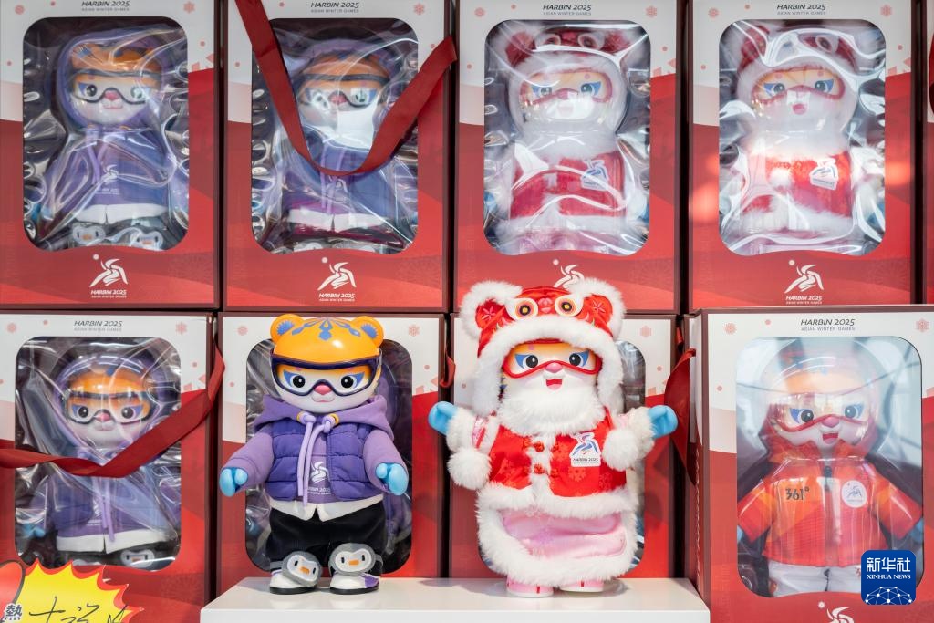 这是1月8日拍摄的哈尔滨一家亚冬会特许零售店内的亚冬会吉祥物纪念品。