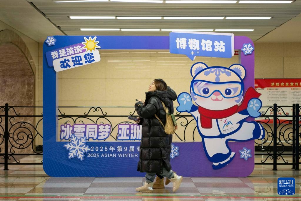 1月8日,在哈尔滨地铁博物馆站,人们经过亚冬会主题展板。