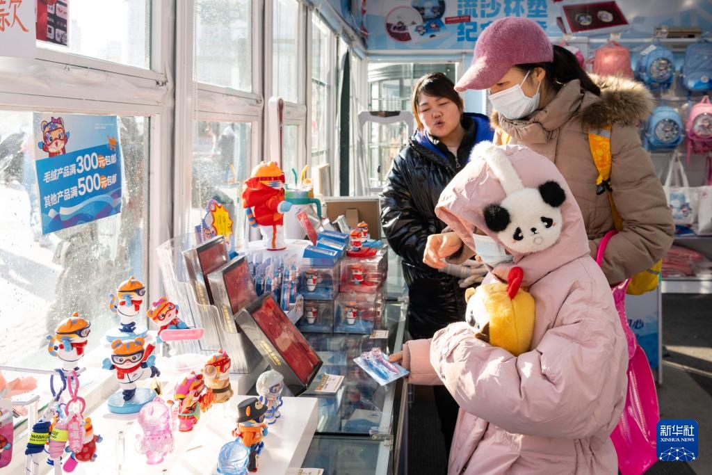 1月8日,游客在哈尔滨一家亚冬会特许零售店内挑选文创产品。