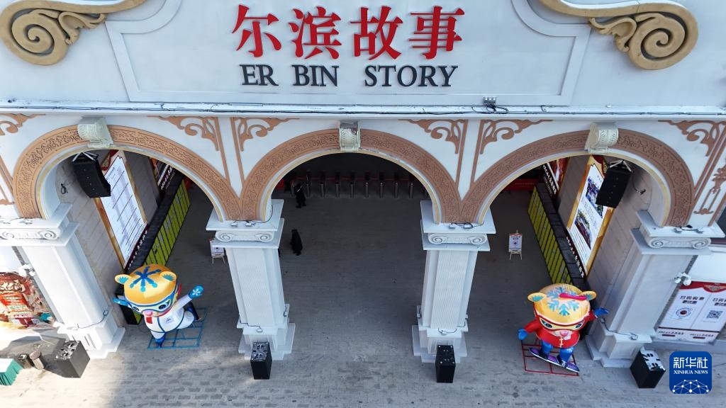 这是1月8日在哈尔滨道外区的中华巴洛克历史文化街区拍摄的亚冬会吉祥物“滨滨”(左)和“妮妮”(无人机照片)。