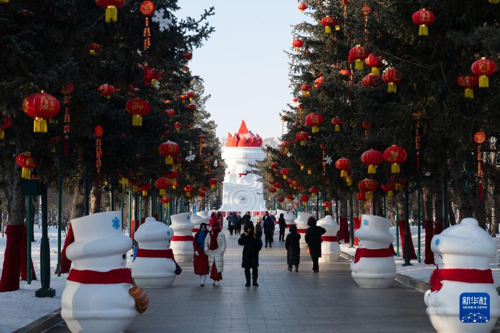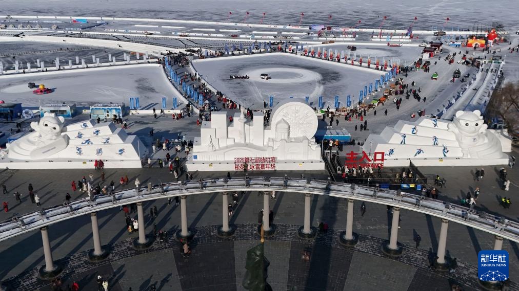 这是1月8日在哈尔滨道里区的防洪纪念塔广场拍摄的亚冬会吉祥物雪雕“滨滨”和“妮妮”(无人机照片)。