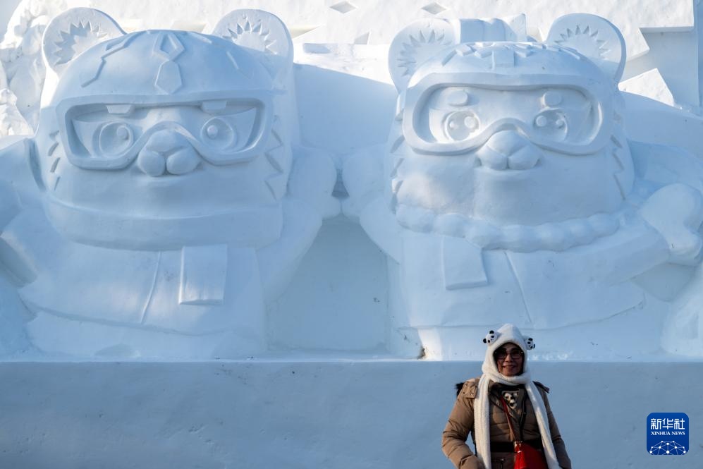 1月8日,在哈尔滨太阳岛雪博会园区,游客在亚冬会吉祥物雪雕前合影留念。