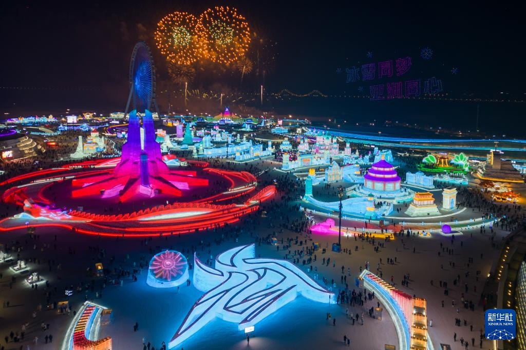 这是1月5日拍摄的第41届中国·哈尔滨国际冰雪节现场上空的烟花秀(无人机照片)。