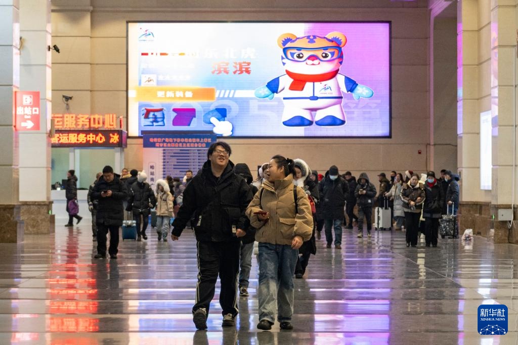 1月8日,在哈尔滨火车站,人们从播放亚冬会宣传片的大屏幕前走过。