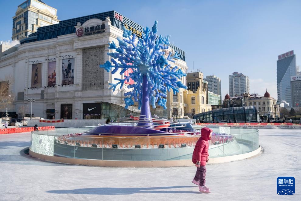 1月8日,在哈尔滨南岗区一处公益冰场,小朋友在“冰雪之冠”雕塑旁滑冰。
