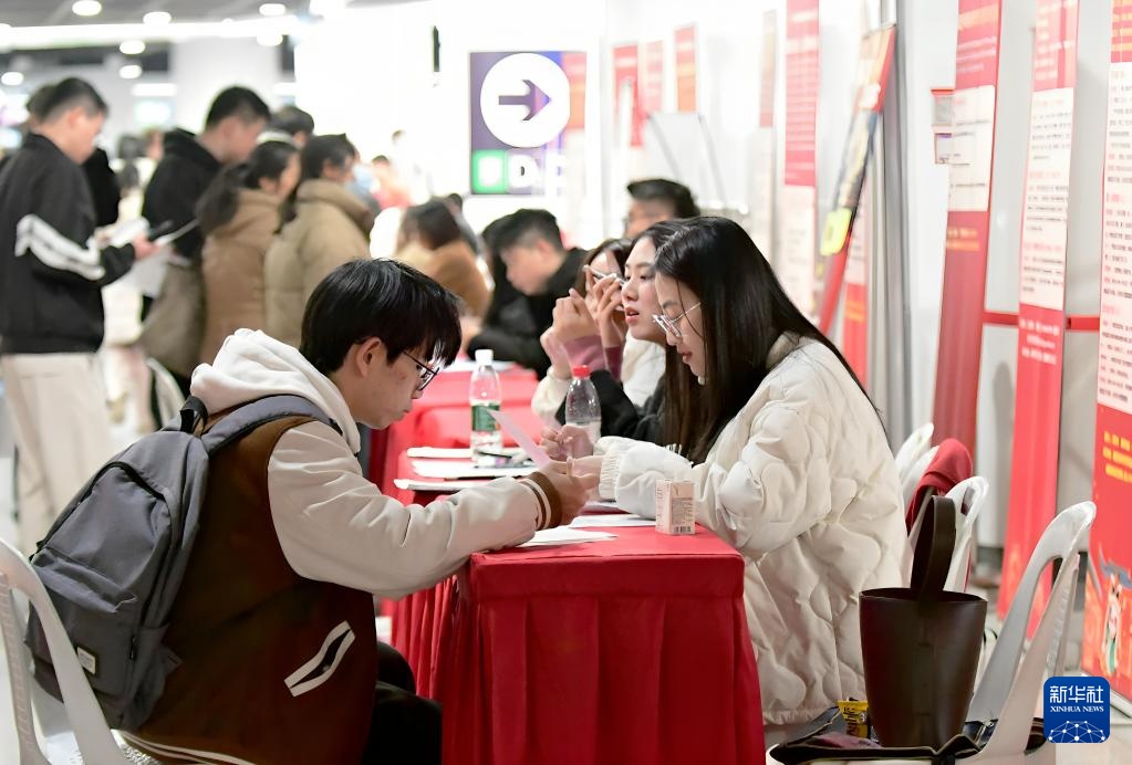 1月10日,一名高校毕业生(前左)在综合类专场招聘会现场填写个人资料。