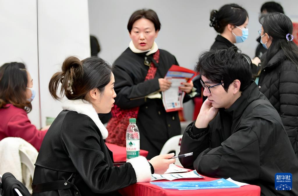 1月10日,在福州市南门兜地铁站内举办的综合类专场招聘会现场,一名高校毕业生与企业招聘人员(左)洽谈。