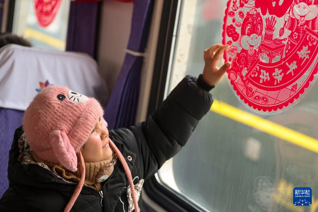 在7557次列车上,一名小朋友在和家人玩耍(1月2日摄)。