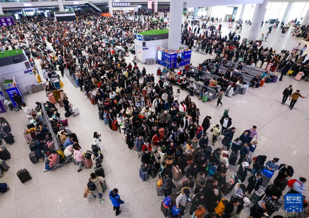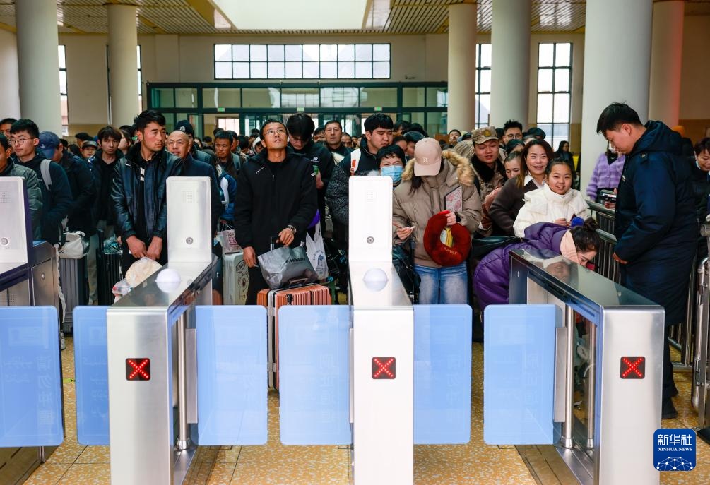 1月9日,在乌鲁木齐站候车大厅,乌鲁木齐铁路公安处民警引导乘坐7556次列车的旅客排队检票。