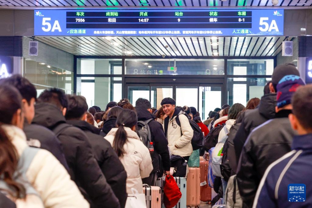1月9日,在乌鲁木齐站候车大厅,乘坐7556次列车的旅客在排队等待乘车。