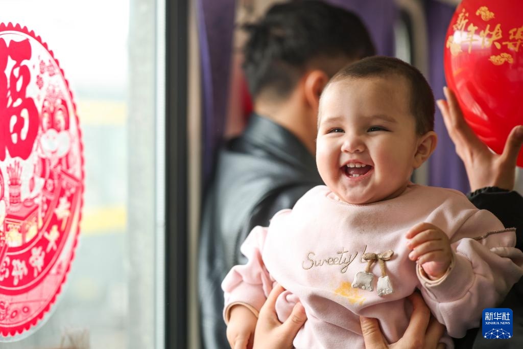 在7557次列车上,一名旅客托起孩子玩耍(1月2日摄)。
