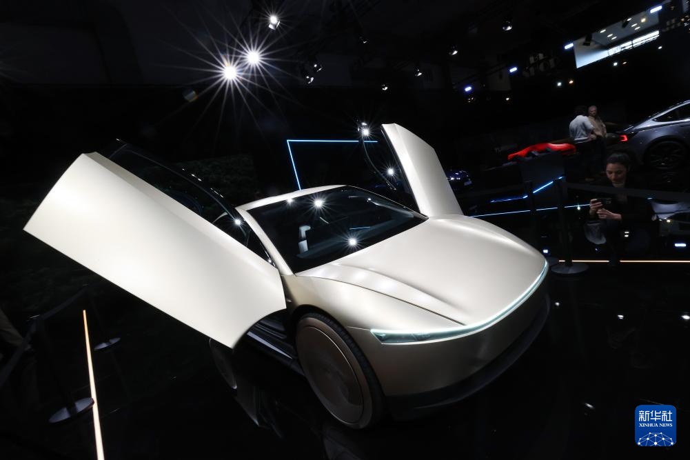 1月10日,在比利时布鲁塞尔举办的2025布鲁塞尔车展上,一名女子拍摄特斯拉Cybercab汽车。