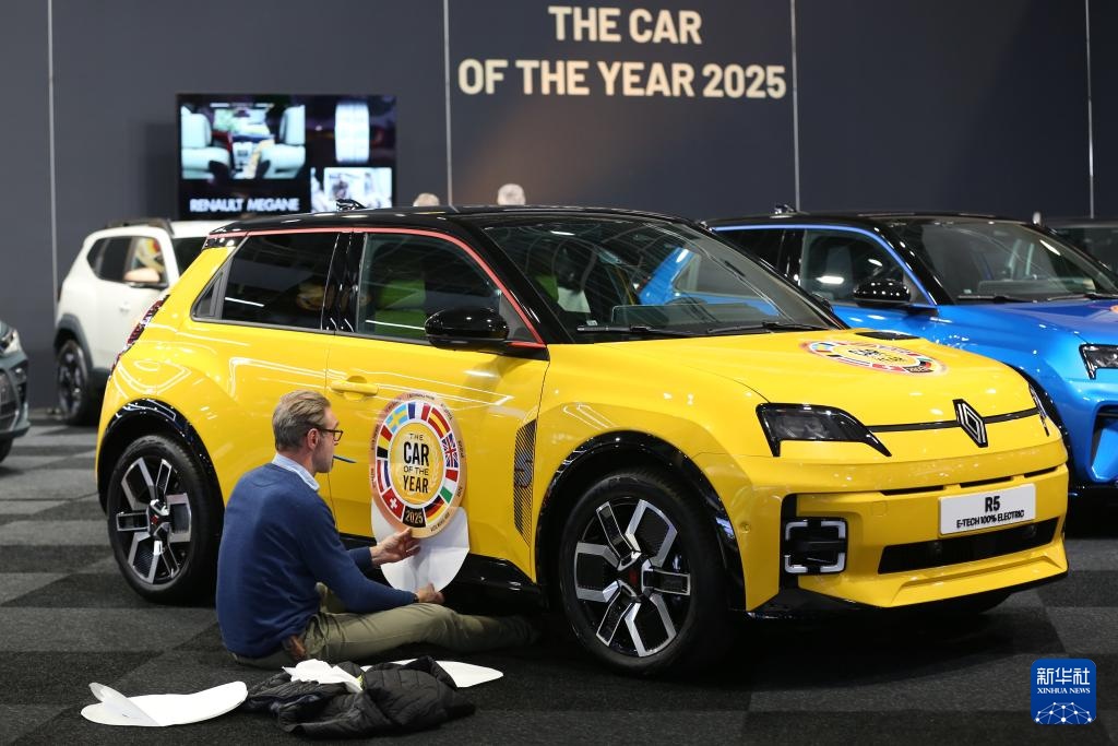 1月10日,在比利时布鲁塞尔举办的2025布鲁塞尔车展上,工作人员为雷诺R5汽车粘贴年度汽车标识。