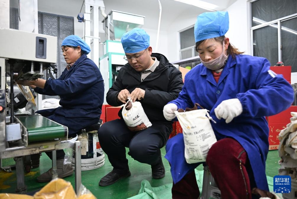1月10日,任宏宇(中)在公司生产车间打包小米产品。