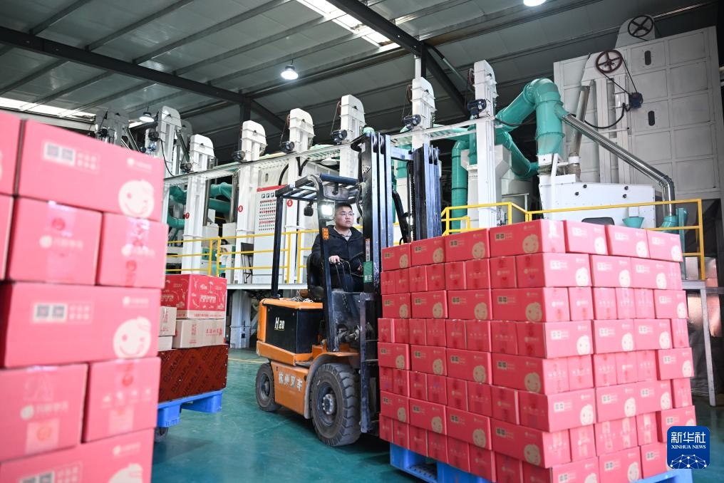 1月10日,任宏宇在公司生产车间驾驶叉车运输小米产品。