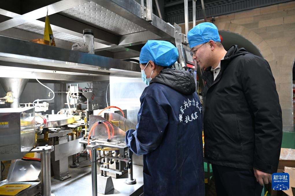 1月10日,任宏宇(右)在公司生产车间查看设备运行情况。