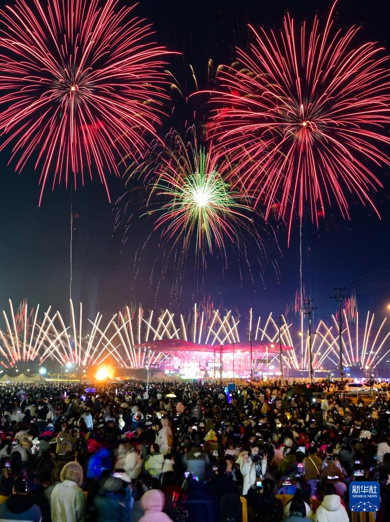 市民和游客在湖南省浏阳市天空剧院附近观看烟花表演(2024年12月28日摄)。