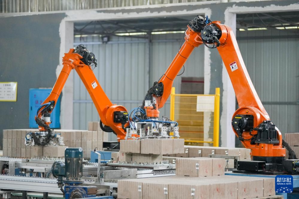 在湖南省浏阳市一家烟花生产企业的厂房,机械臂在烟花产品下线流水线上作业(1月7日摄)。