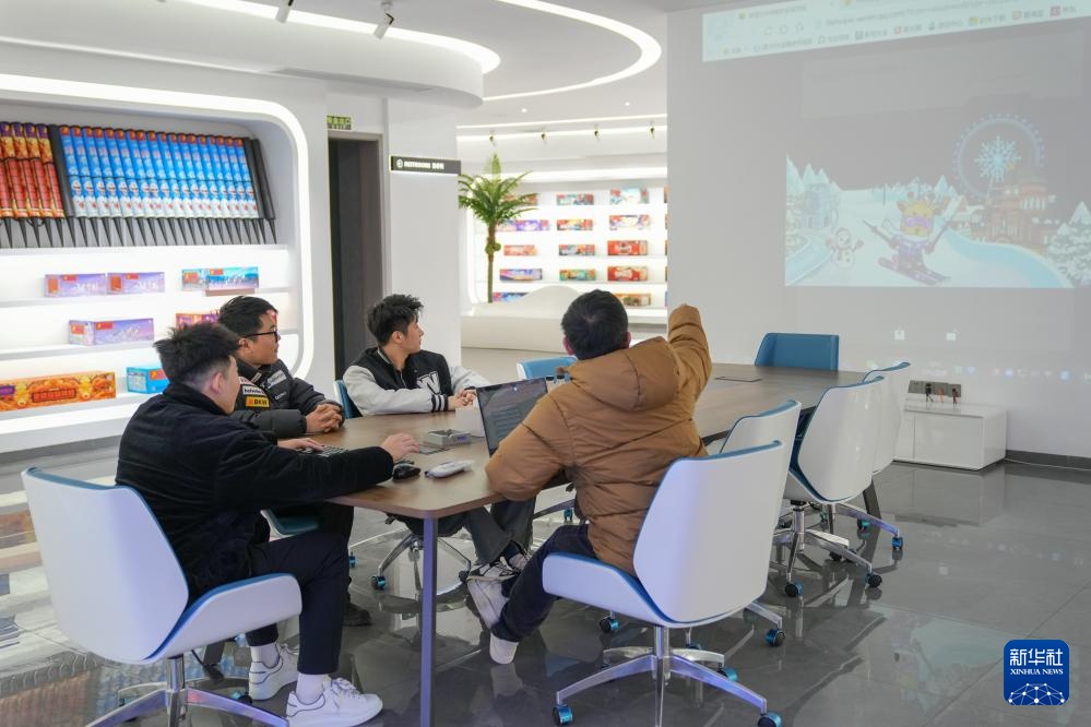 在湖南省浏阳市一家烟花贸易企业,“00后”创业合伙人吴明阳、胡裕杨、孙卓、李达朝(从左至右)在讨论烟花产品的设计(1月7日摄)。