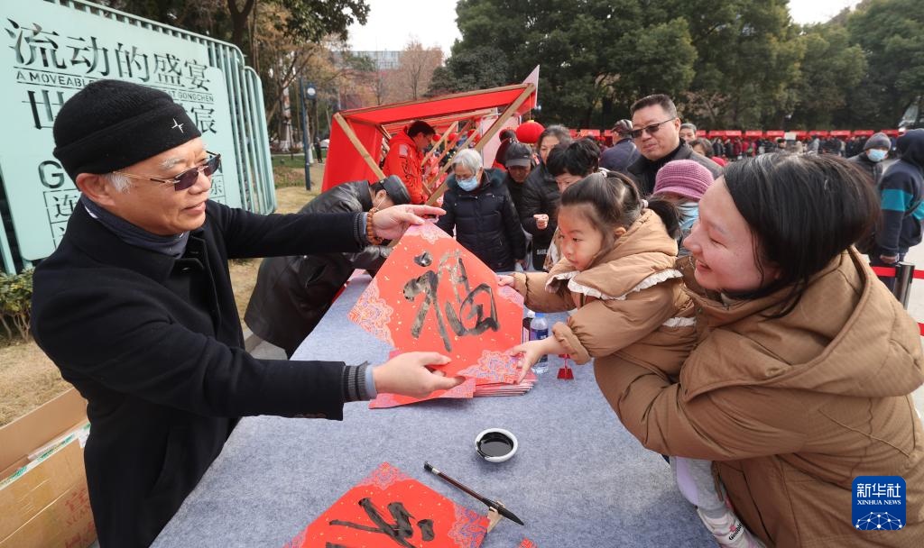 1月11日,书法爱好者活动现场写福字送给市民。