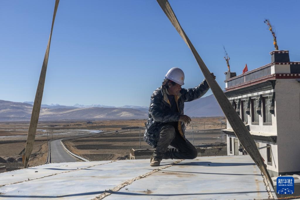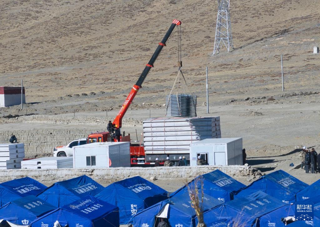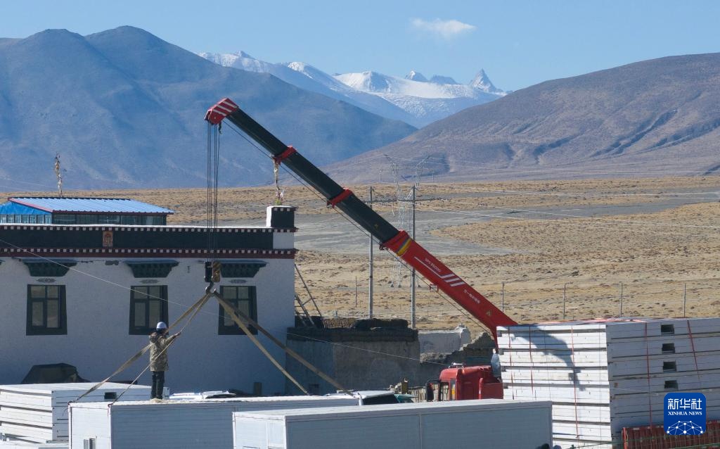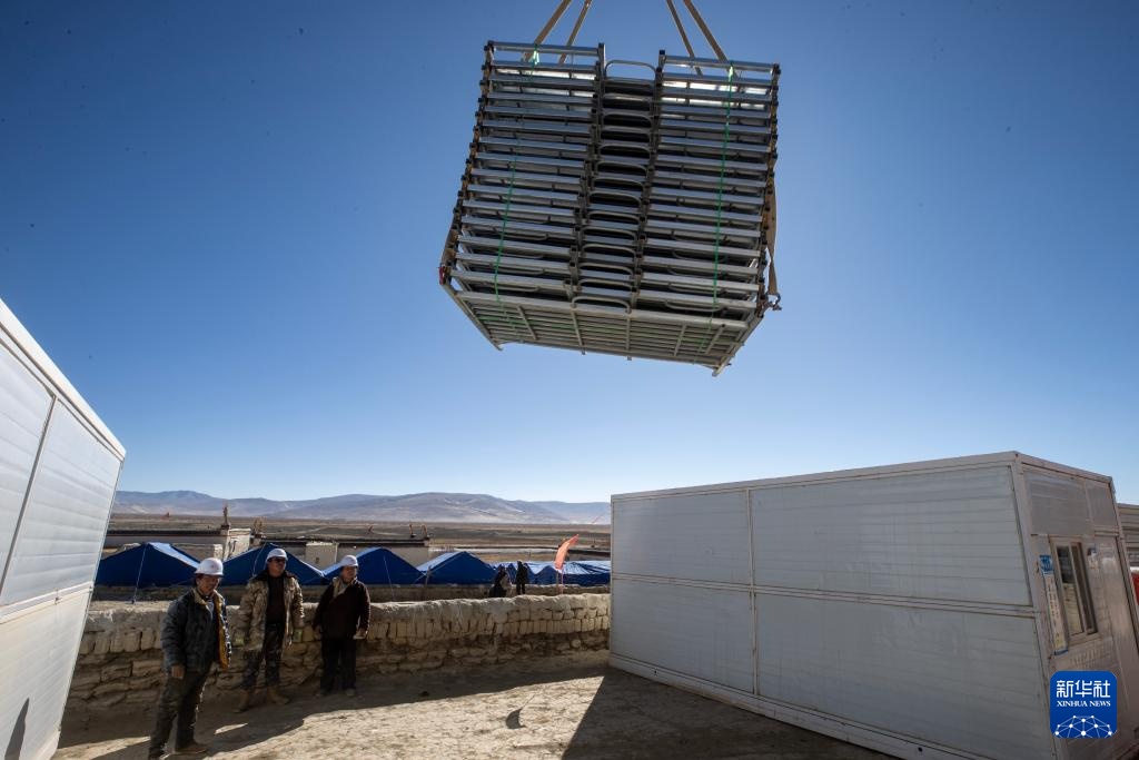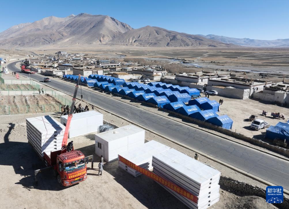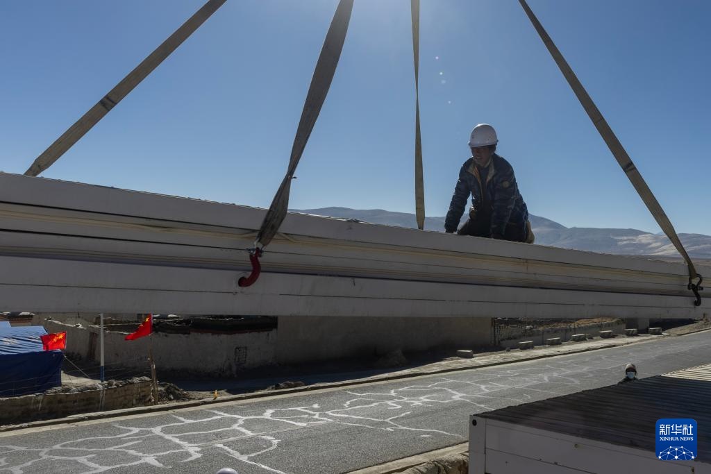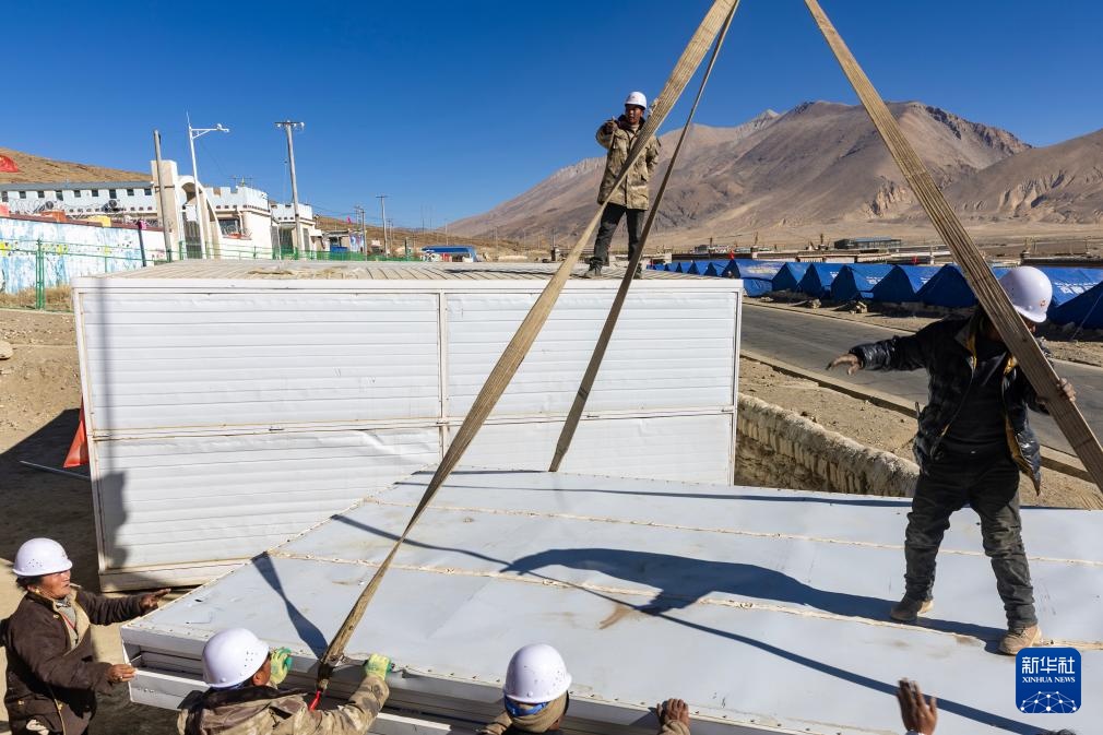 当日,在萨迦县麻布加乡白拉村,工程人员与有相应技术的村民一起建设活动板房。据了解,这是萨迦县地震灾区开建的第一批板房。