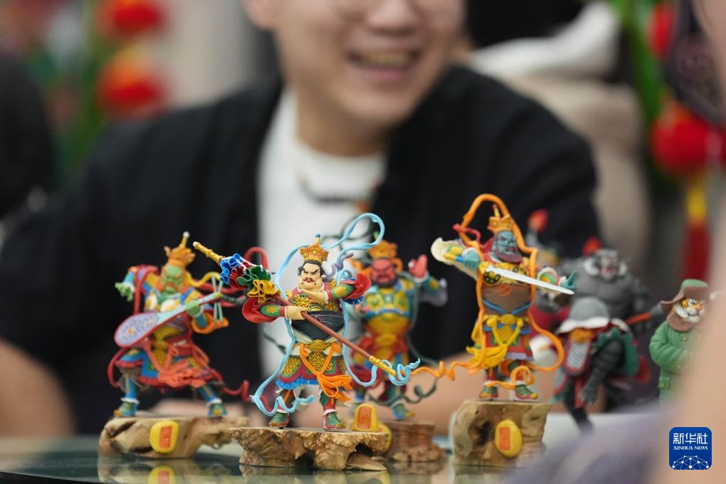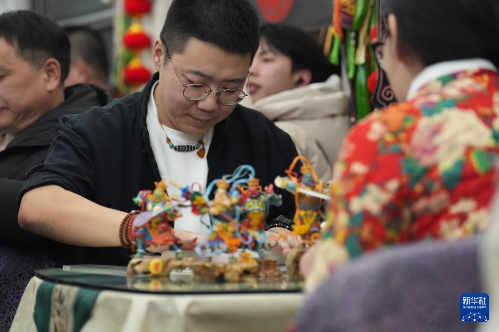 1月11日,康氏面塑传承人康建在K7041次列车上展示面塑。