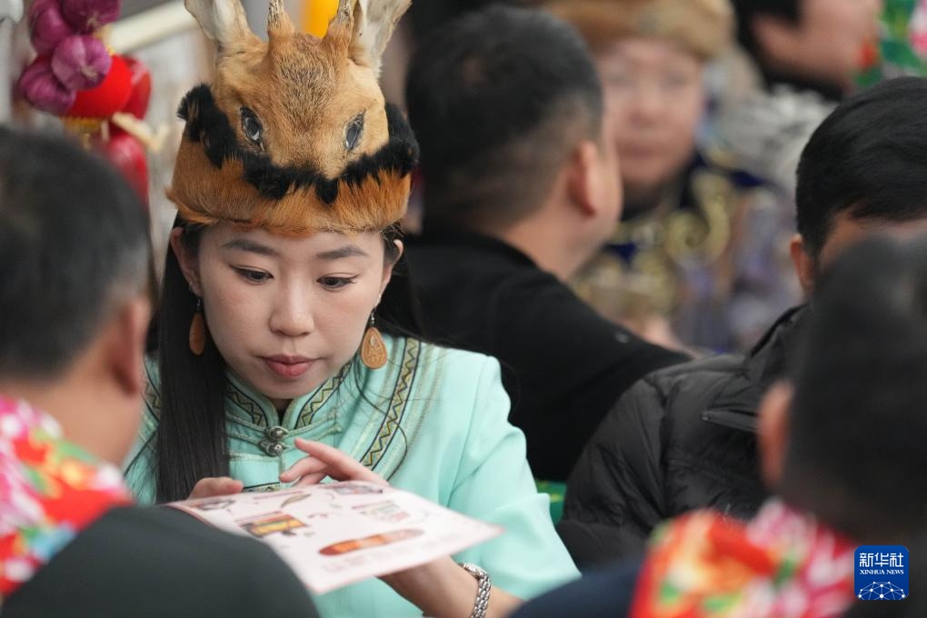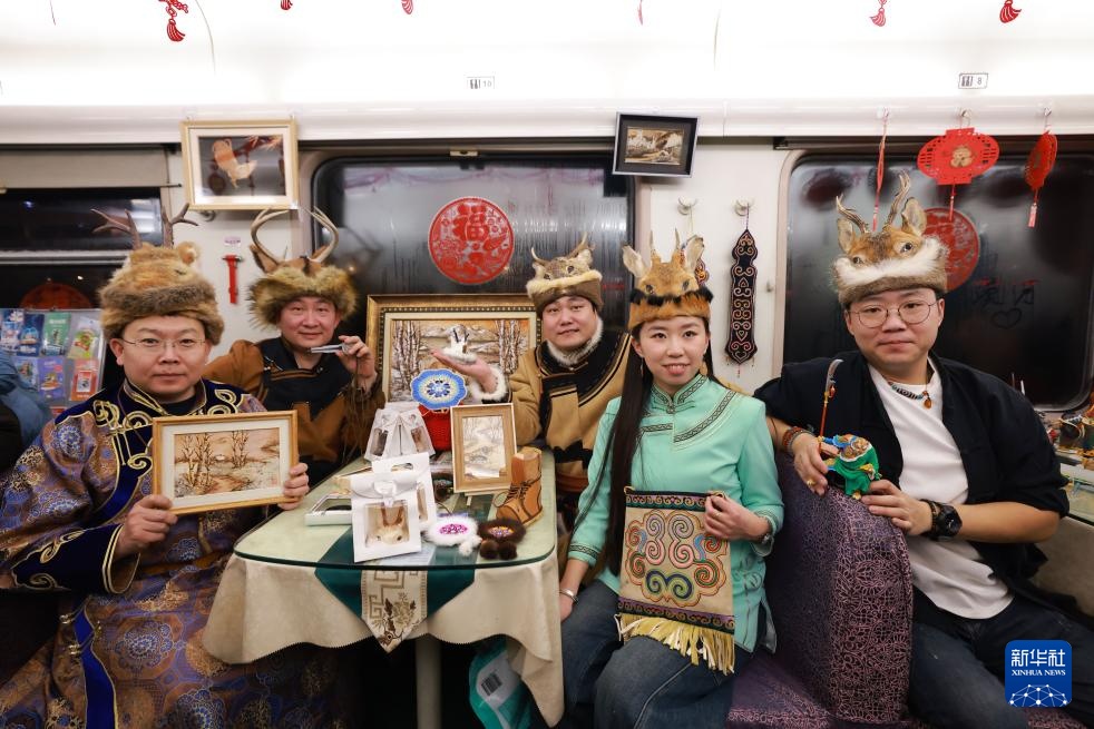 1月11日,在哈尔滨开往漠河的K7041次列车上,五名鄂伦春族非遗文化传承人为旅客展示非遗项目。