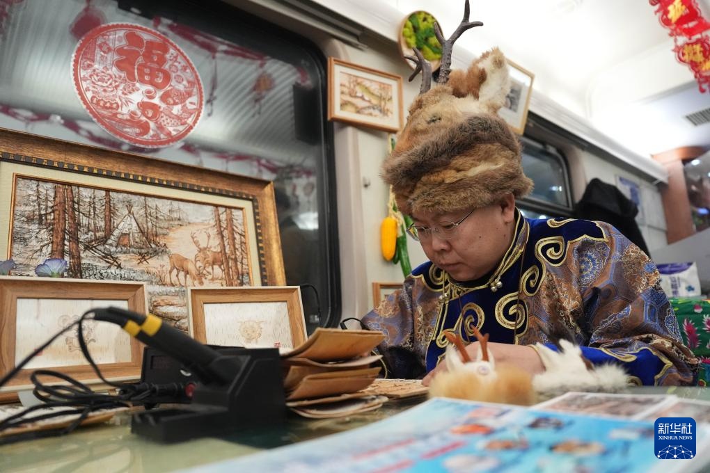 当日,在哈尔滨开往漠河的K7041次列车上,五名鄂伦春族非遗文化传承人为旅客展示桦树皮烫画、面塑、刺绣等非遗项目。据了解,这是中国铁路哈尔滨局集团有限公司开行的首趟民族非遗文化列车。随着黑龙江省冰雪游持续火热,中国铁路哈尔滨局集团有限公司联合大兴安岭地区文体广电和旅游局,在哈尔滨至漠河方向开行民族非遗文化列车,邀请非遗传承人现场展示传统民族技艺,弘扬民族文化。