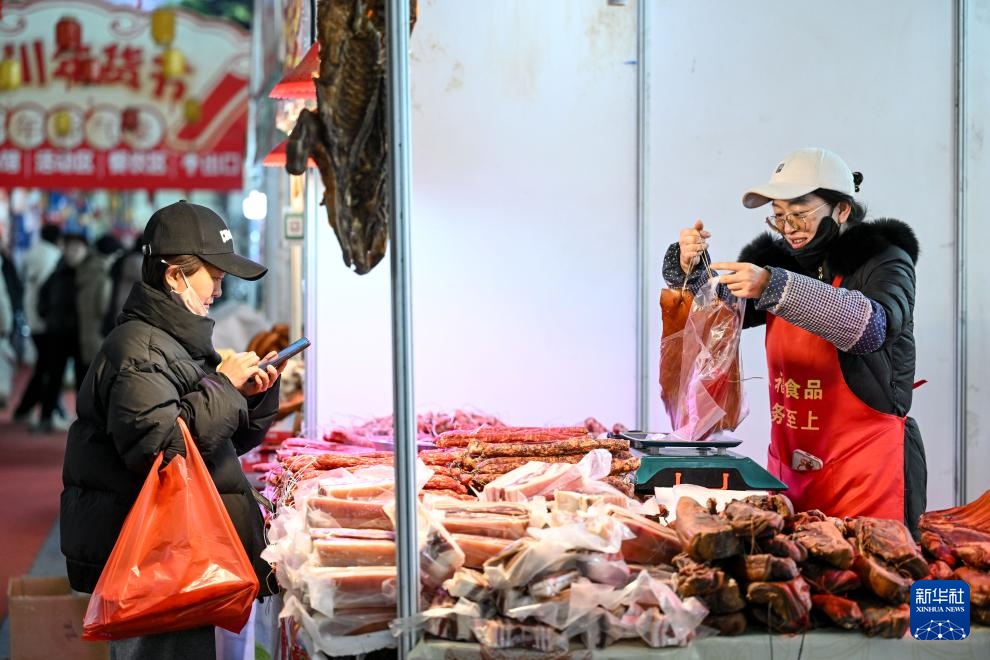 1月12日,市民在2025银川年货节上选购腊肉。