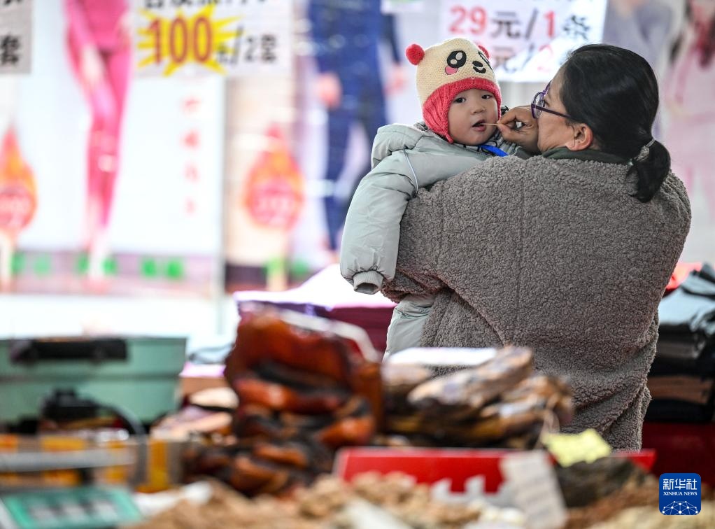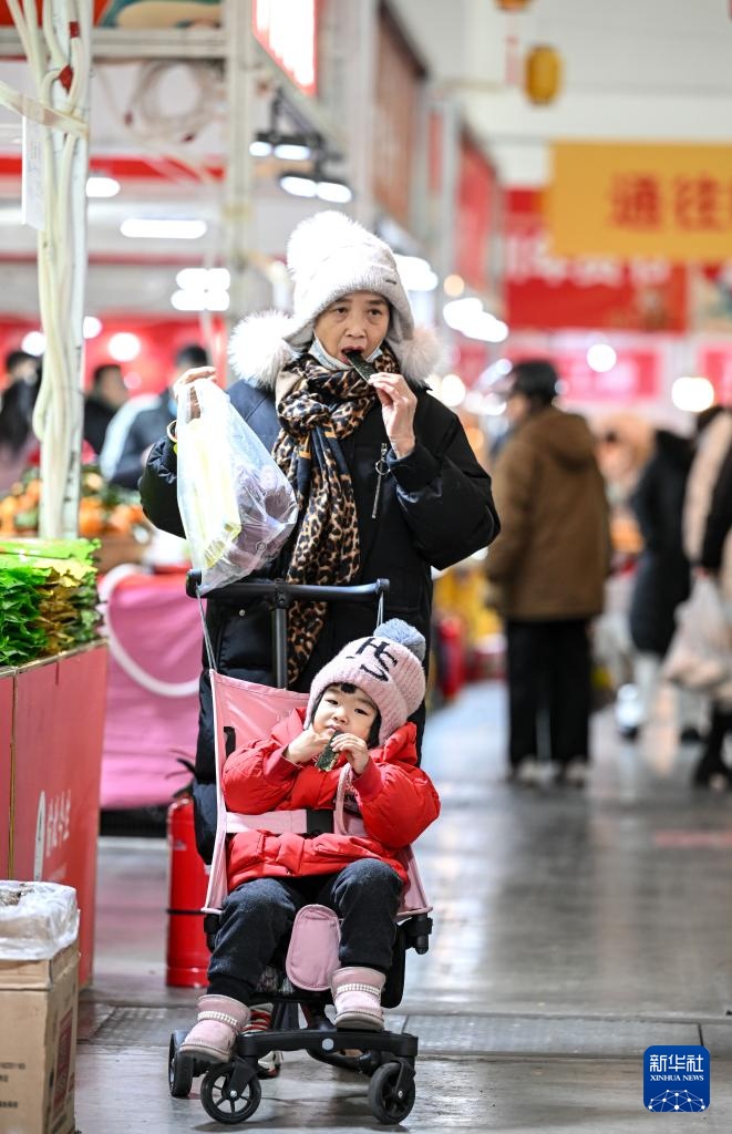 1月12日,市民带着孩子在2025银川年货节上品尝小吃。