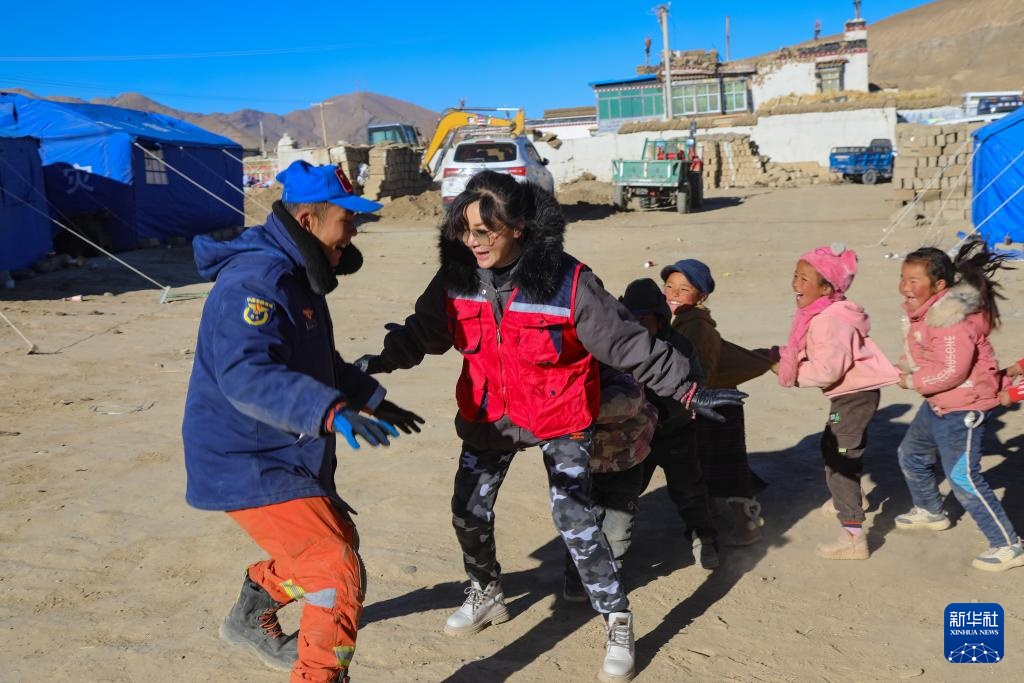 1月10日,在定日县曲洛乡措昂村的受灾群众安置点,谭惜仁(左二)与西藏森林消防总队的救援人员(左一)一起带着孩子们与玩游戏。