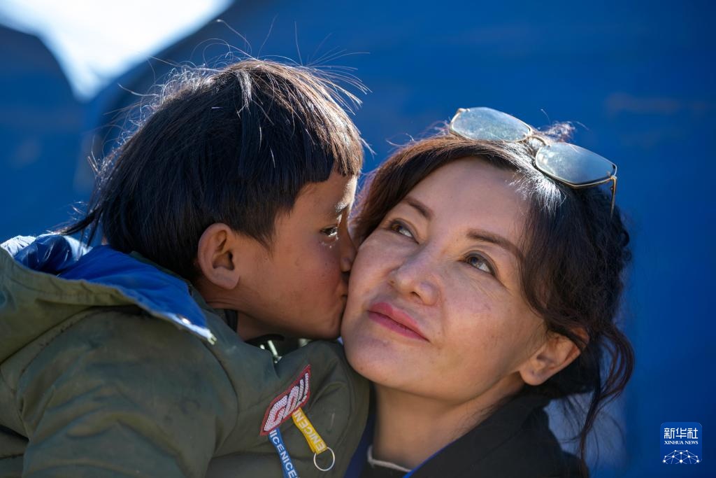 1月11日,在定日县曲洛乡措昂村的受灾群众安置点,一名女孩亲吻谭惜仁(右)。