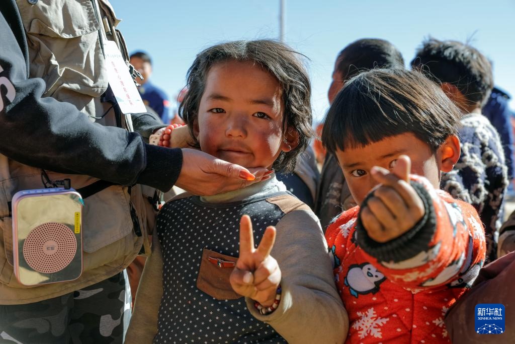 1月11日,在定日县曲洛乡措昂村的受灾群众安置点,谭惜仁(中)与孩子们在一起。