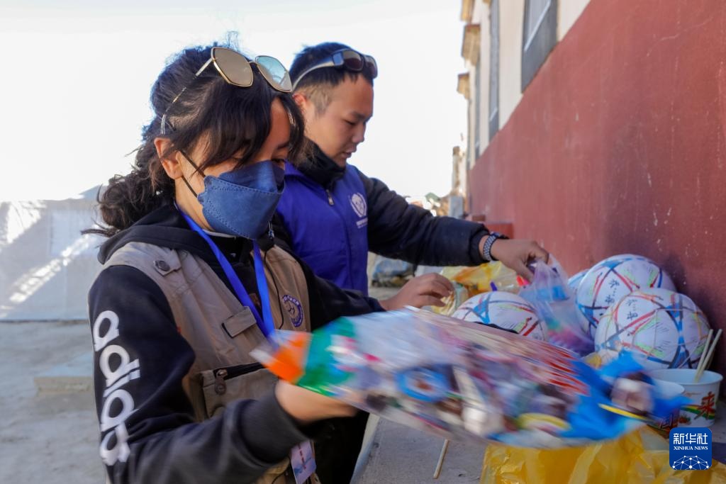 1月11日,在定日县曲洛乡措昂村的受灾群众安置点,谭惜仁(左)与志愿者一起整理捐给孩子们的足球、画笔、食品等物资。
