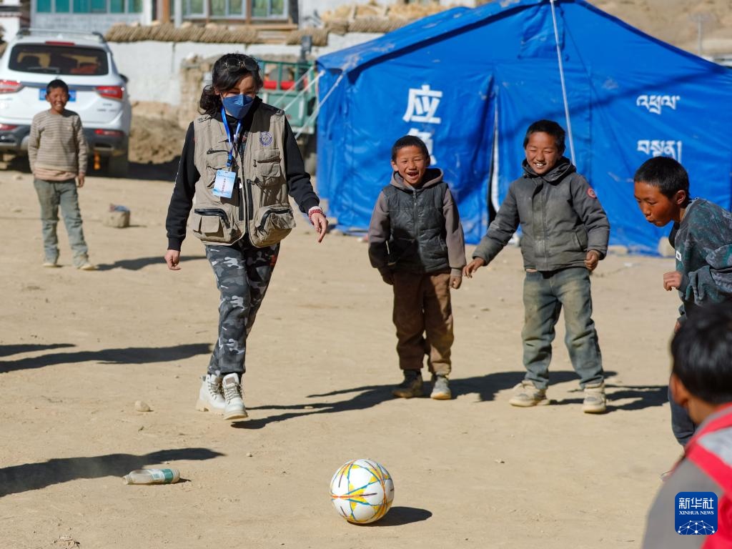 1月11日,在定日县曲洛乡措昂村的受灾群众安置点,谭惜仁与孩子们一起踢足球。
