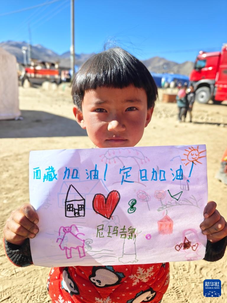1月11日,在定日县曲洛乡措昂村的受灾群众安置点,藏族女孩尼玛吉宗展示她的画作。