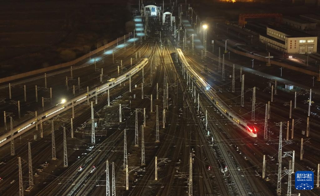 1月14日,在天津动车客车段动车运用所停车场,两列动车组发车驶往车站(无人机照片)。