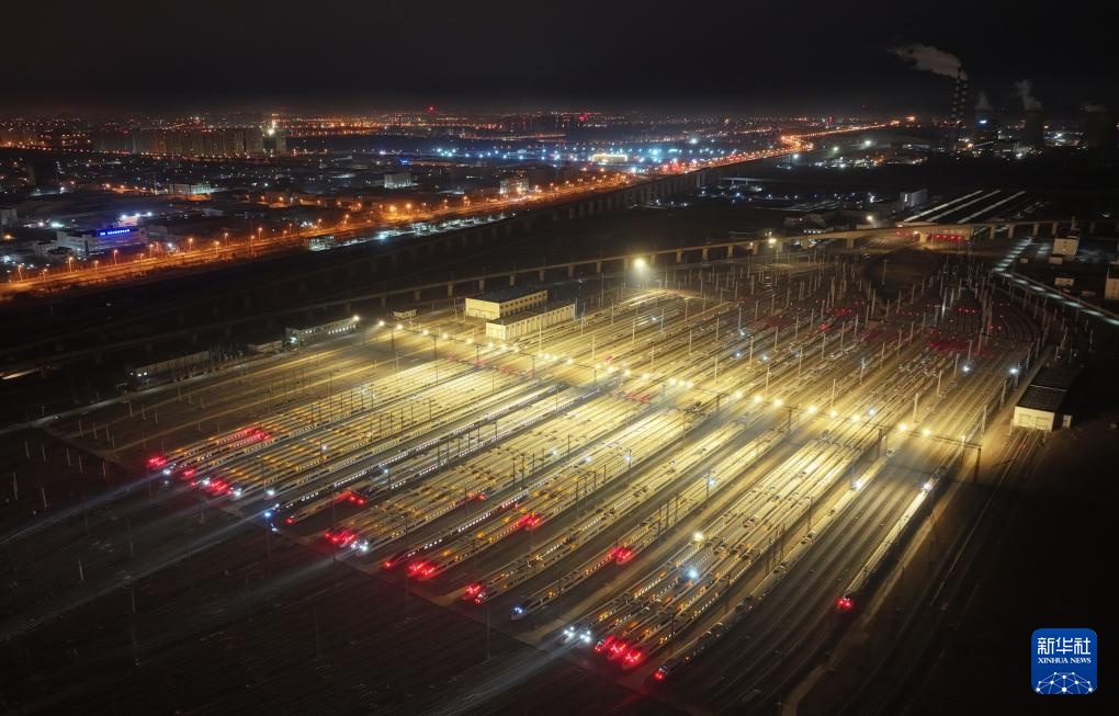 1月14日,在天津动车客车段动车运用所停车场,一列动车组发车开往车站(无人机照片)。