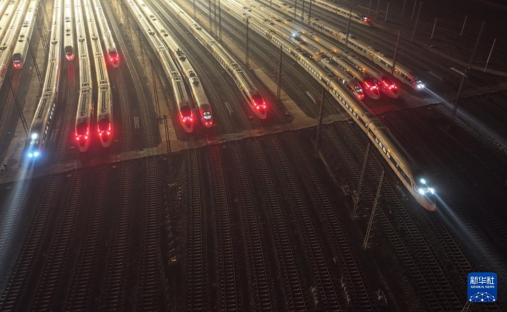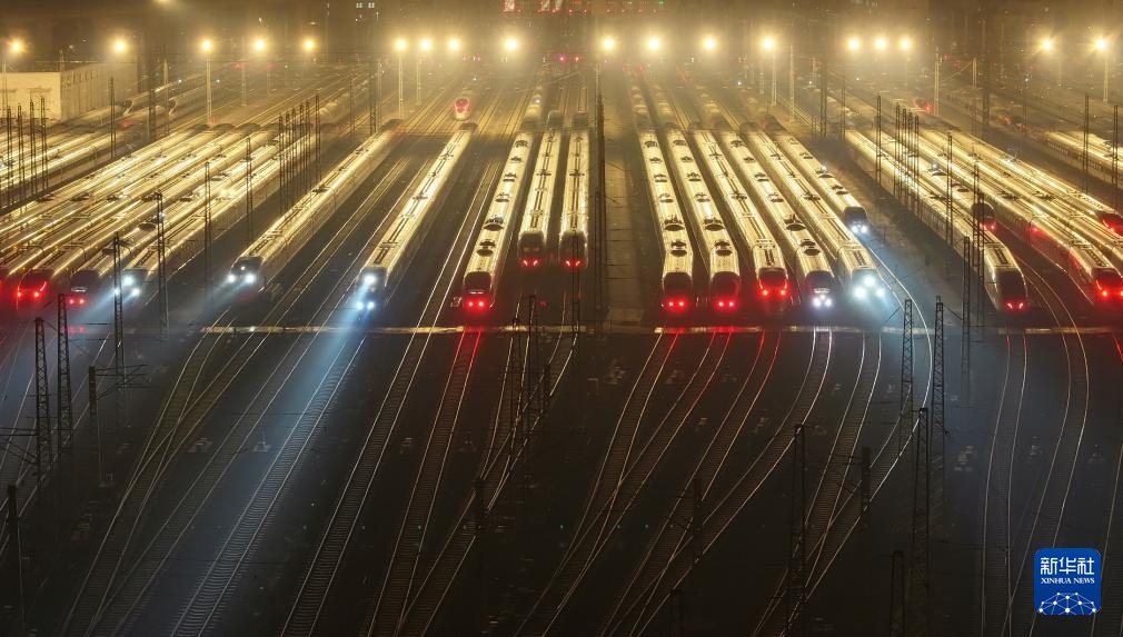 1月14日,动车组列车在铁路天津动车客车段动车运用所停车场整装待发(无人机照片)。