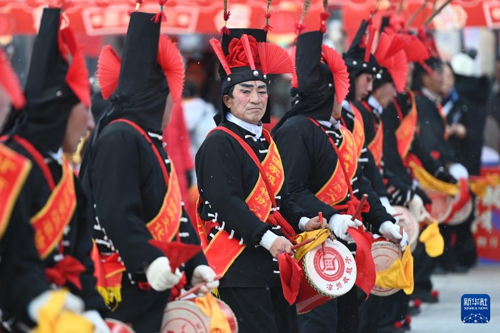 1月14日,演员表演国家级非物质文化遗产——凉州攻鼓子。