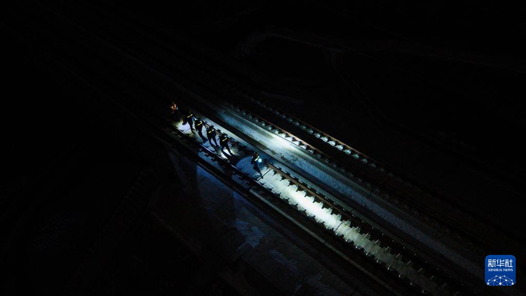 1月14日凌晨,桥隧工和线路工在新乌鞘岭隧道内开展检查作业(无人机照片)。