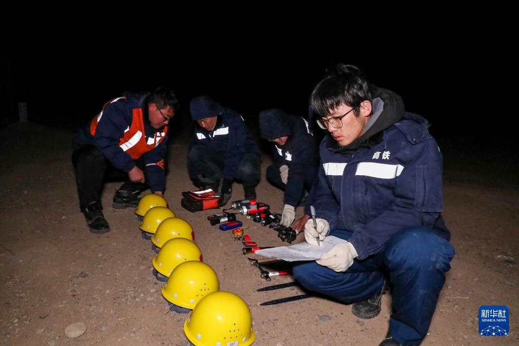 1月13日晚,在天祝西高铁综合维修基地,线路工正在清点工具材料。