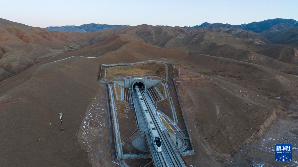 1月14日8时20分许,兰州西发往武威东的D8885次动车组列车穿过新乌鞘岭隧道(无人机照片)。