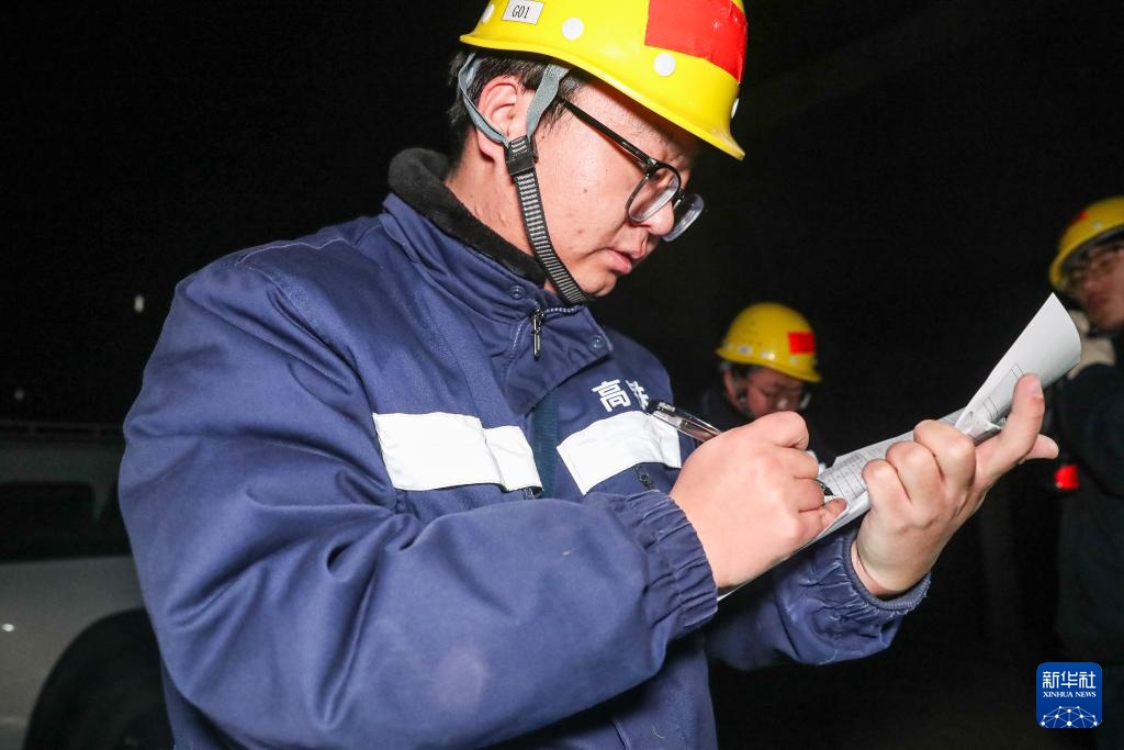 1月13日晚,在新乌鞘岭隧道通道门外,“95后”桥隧工工长金炻正在清点工具材料。