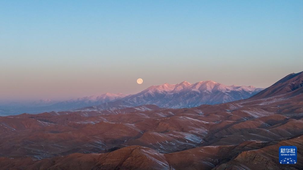 这是1月14日在新乌鞘岭隧道附近拍摄的山脉与月亮(无人机照片)。