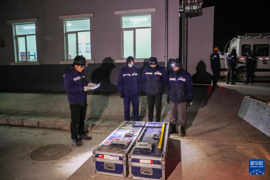 1月14日凌晨,在新乌鞘岭隧道通道门外,桥隧工在上道前清点工具材料。