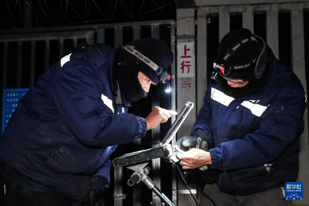 1月14日凌晨,在新乌鞘岭隧道内,“90后”线路工工长康川(左)使用铁路轨道检查仪检查线路几何尺寸。