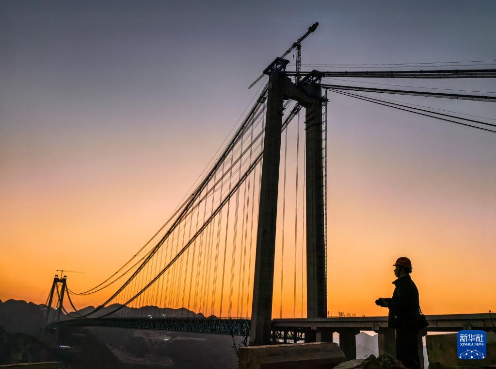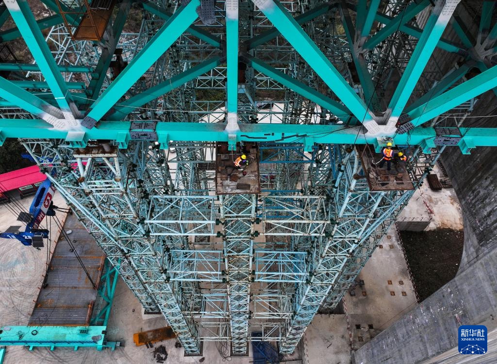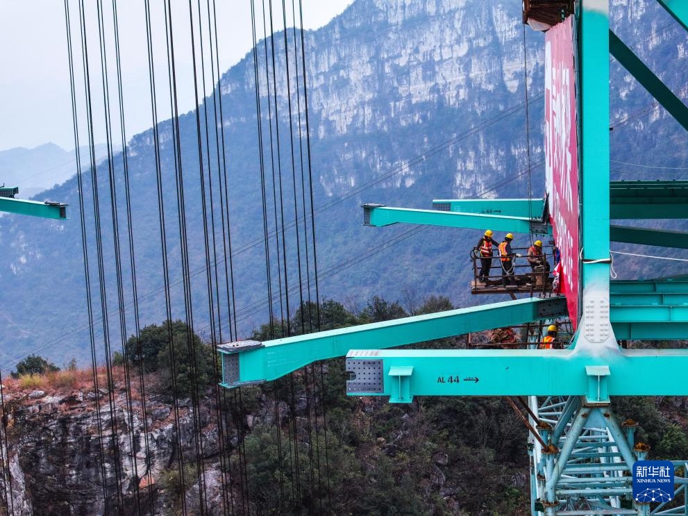 1月14日,工人在为吊装贵州六安高速公路花江峡谷大桥最后一个节段钢桁梁做准备。