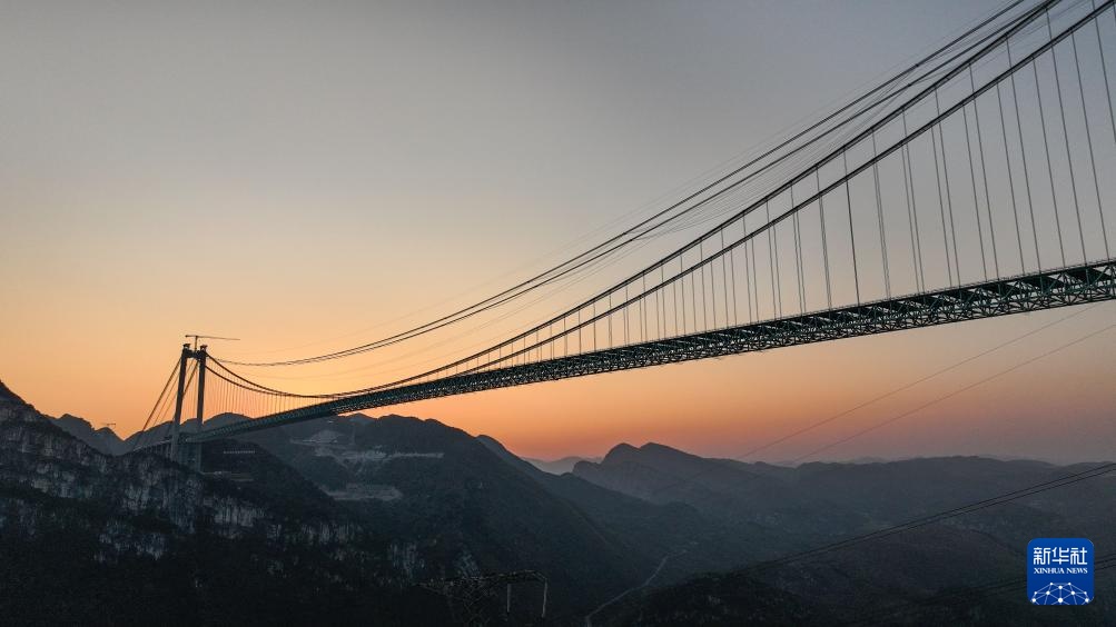 夕阳下的贵州六安高速公路花江峡谷大桥(1月13日摄,无人机照片)。